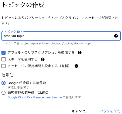 Cloud Pub/Subトピック : 1-3で作成したstop-vm-topicを指定