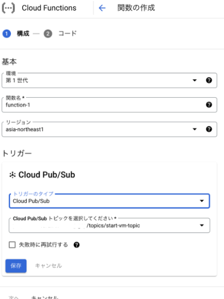 Cloud Pub/Subトピック : 1-3で作成したstart-vm-topicを指定