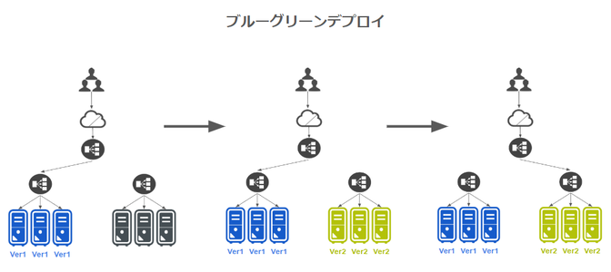 稼働中サーバー(ブルー側)とは別のサーバー(グリーン側)に対して新バージョンをデプロイする方法です。動作確認が問題なければ、ブルー側を切り離して、グリーン側接続して新バージョンを公開します。