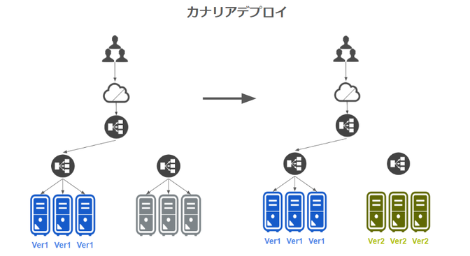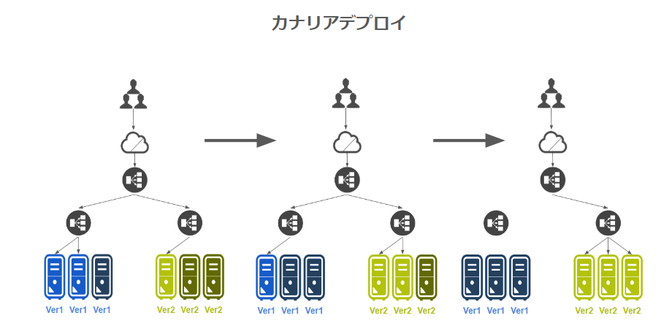 カナリアデプロイは、ブルーグリーンデプロイのグリーン側にデプロイを行った後、少しずつ新バージョンへ移行していく方法です。