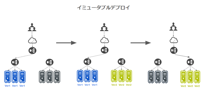 イミュータブルデプロイメントとは、デプロイの完了後に旧環境を削除する手法です。ブルーグリーンデプロイとは旧環境を削す点で異なります。