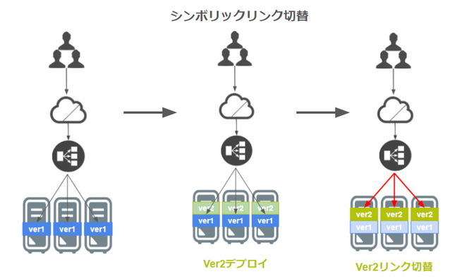 シンボリックリンク切替とは、稼働中のサーバーの別の環境にデプロイを実施し、アプリケーションの起動リンクを新バージョンに切り替える手法です。