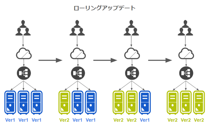 ローリングアップデートとは、サーバ一台ずつ順番にデプロイを実施してリリースする方法です。サーバーを一つずつ順番に切り離して、デプロイ作業を実施します。