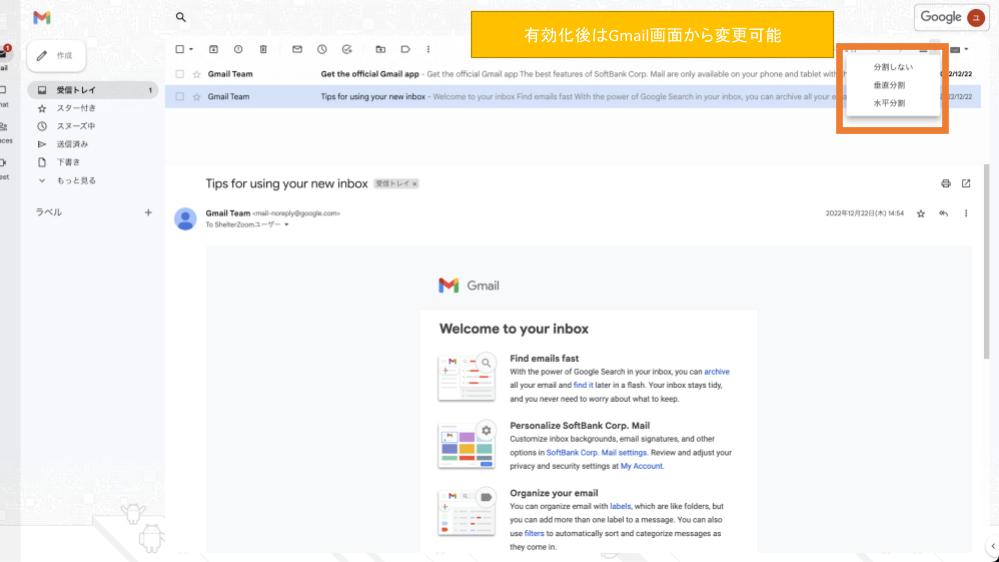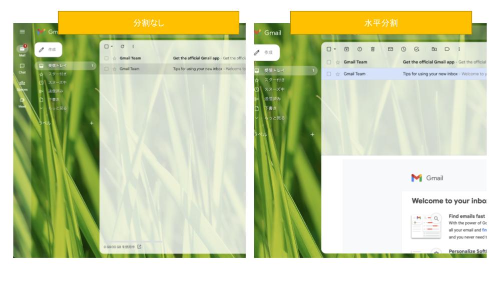 個人的には垂直分割だと横幅が狭い分件名等の文字が切れてしまいやすくなるので、水平分割がお気に入りです