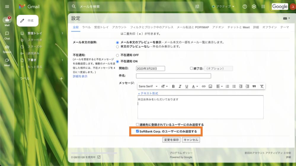 なお、[連絡先に登録されているユーザーにのみ返信する] と [<ドメイン> のユーザーにのみ返信する] のチェックボックスの両方をオンにした場合、不在通知は両方に登録されているユーザーにのみとなるためご注意ください。