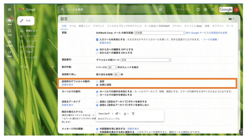 全般 → 返信時のデフォルトの動作を「全員に返信」にする