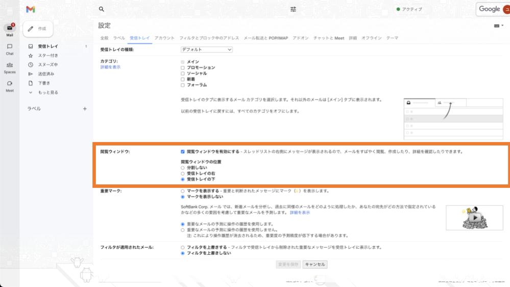 受信 → 閲覧ウィンドウ:閲覧ウィンドウを有効化する を オン ※クイック設定の閲覧ウィンドウも同じです。