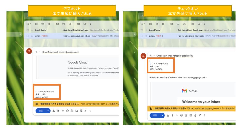 そこで、こちらの設定を有効化すると返信文の直下に署名が入ってくれるようになります。