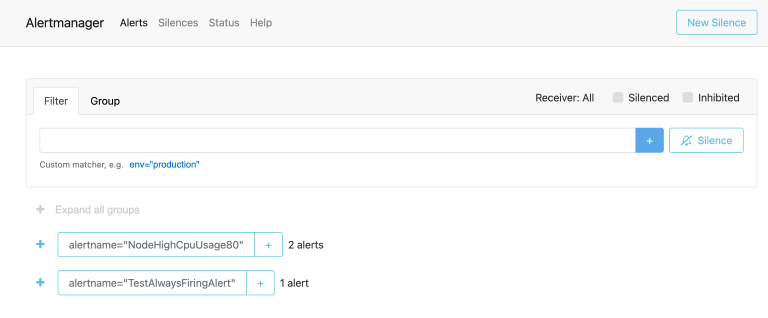 すると、ブラウザでhttp://localhost:9093を訪問するとAlertmanagerのWeb UIが見えるはず: