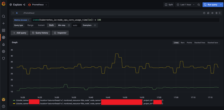 以下のテストPromQLを使って、Cloud MonitoringからMetricsを取得できるかどうかをためします(GKS上NodeのCPU利用率を調べるクエリー):