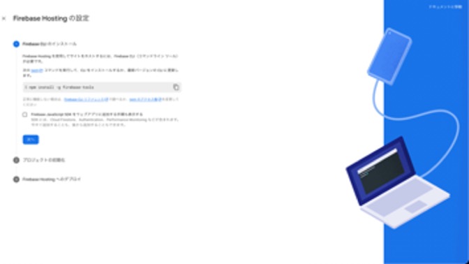 6. はじめにFirebase CLIのインストールを求められます。私の環境ではnpmを使うことができなかったので、Firebase CLI リファレンスを参考に自動インストール スクリプトを使ってインストールを行いました。