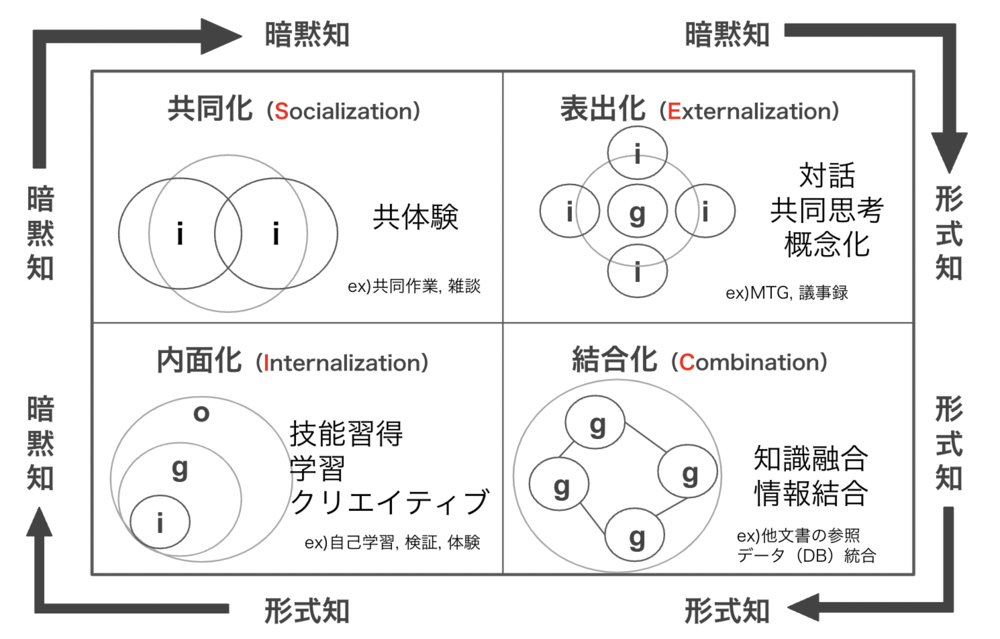 ナレッジマネジメントを実現するフレームワーク(モデル)が、一橋大学大学院教授の野中郁次郎氏らによって提唱されました。このモデルが、現在のナレッジマネジメントの基礎理論になったと言われています。