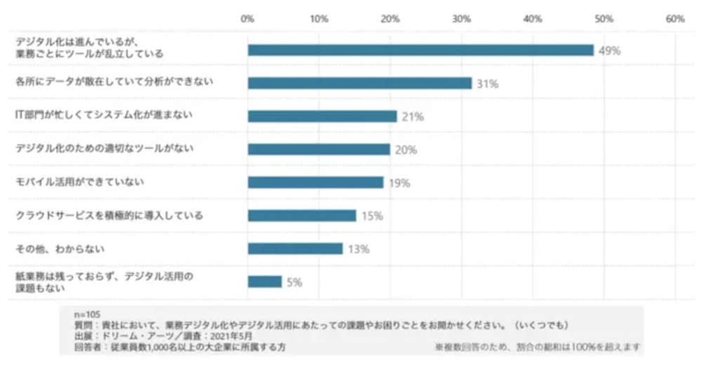 これまでの話から、ナレッジマネジメントのSECIモデルなどをベースにすることで適切なITソリューションの導入が、場の活性化に繋げることができると考えることができると思います。これらに合った様々なITソリューションが出ていますし、多くの企業ではDX推進の一つとしてこのような取り組みを行っているところも近頃多く見かけます。しかし、適切なナレッジマネジメントを考えなければ多くの課題が新たに生み出されてしまいます。例えば、システムやマニュアルなどの文書情報の乱立などが挙げられます。以下はデジタル化に関するアンケートです。システムの乱立やデータの散在が上位二つを占めていることがわかります。