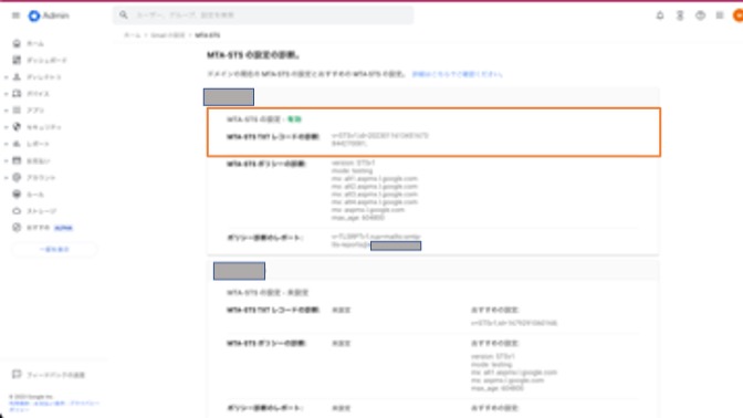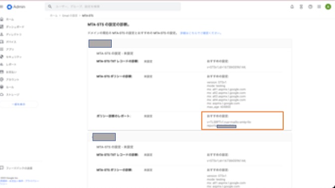 DNSに管理コンソール記載のポリシー診断のレコードを登録します。登録が正しく行われてたらおすすめの設定欄が空白となり、Googleサーバーが検知した値が表示されます。