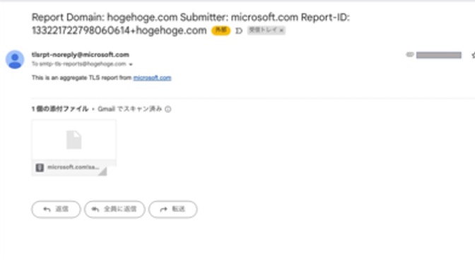 送信レポートを作成するためにGoogle Workspaceをご利用であればMicrosoft365等からテストメールを送信する必要があります。この例では実際にMicrosoftから受信したTLSレポートを記載しています。一部ドメイン名等は変更していますがほぼこの内容のものが届くようになります。