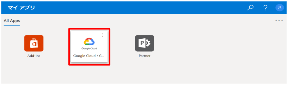 Azure AD ギャラリーの参照画面より「Google Cloud Platform」のアイコンをクリックします。画面右下の「作成」をクリックします。「すべてのアプリケーション」の順にクリックし、「Google Cloud / G Suite Connector by Microsoft」をクリックします。