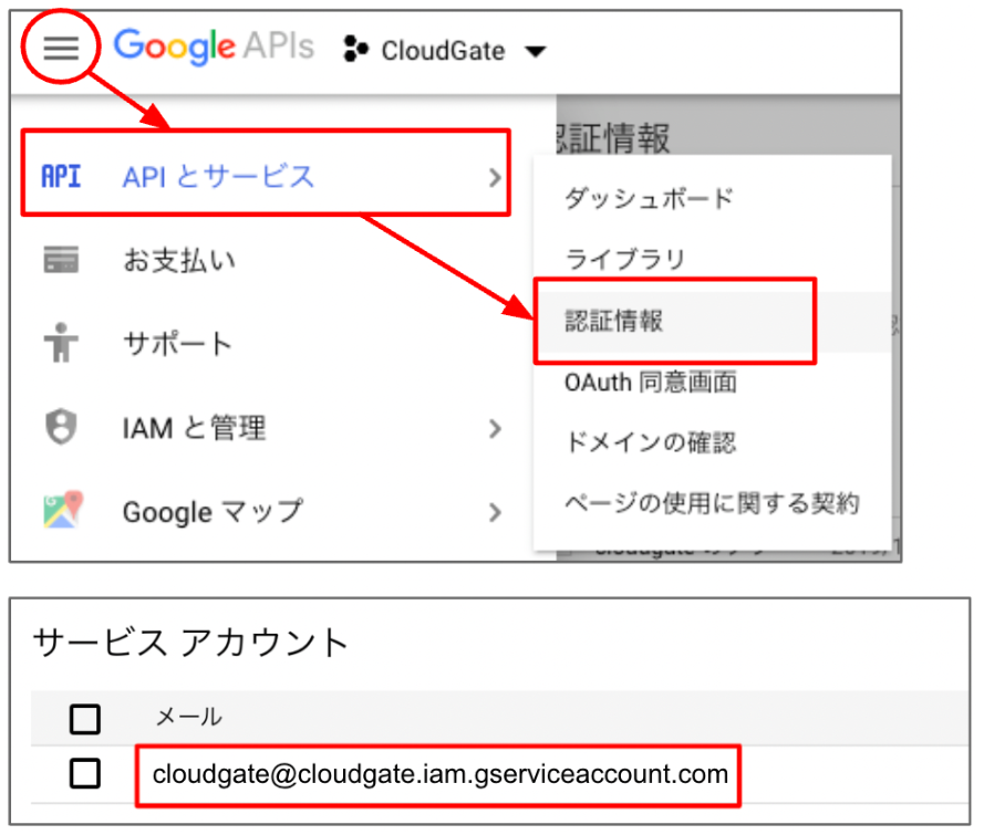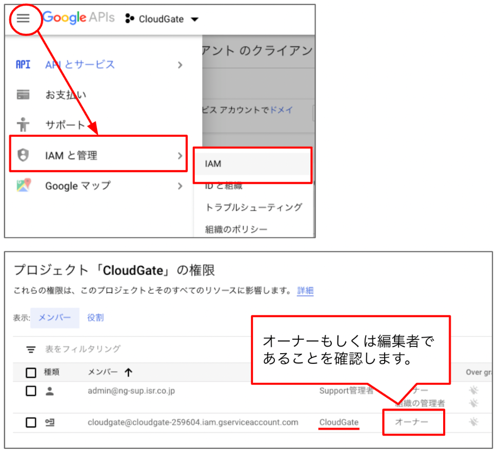 ナビゲーションメニューから「IAMと管理」>「IAM」をクリックし、表示された画面で、「CloudGate」プロジェクトの役割が、「オーナー」もしくは「編集者」であることを確認します。
