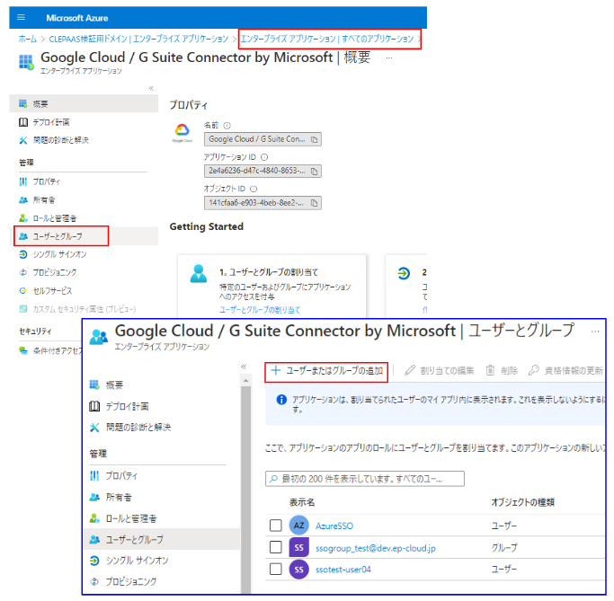 Azureポータルから [Azure AD] → [エンタープライズアプリケーション] を選択し、[Google Cloud / G Suite Connector by Microsoft] を選択し、[ユーザーとグループ] をクリックします。