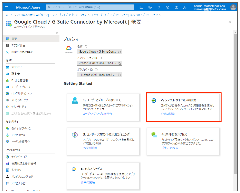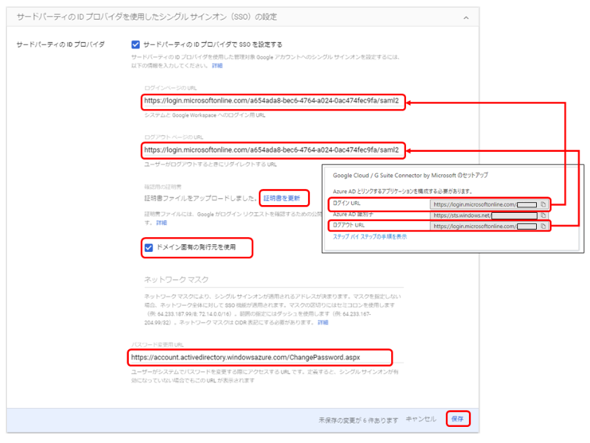 | 2 | ログインページの URL | Azure ポータルの Google Cloud / G Suite Connector by Microsoft のセットアップからコピーした、 ログイン URL を貼り付けます |