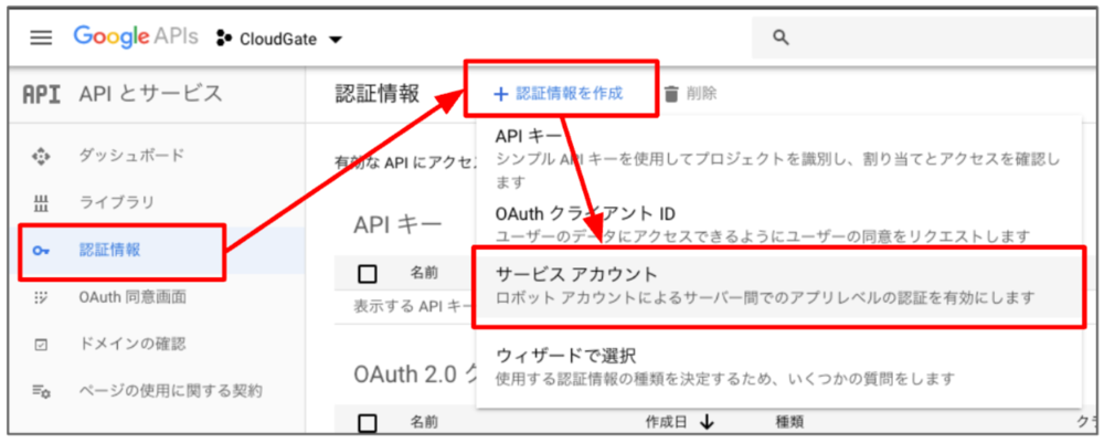 左メニューから「認証情報」>「認証情報を作成」>「サービスアカウント」をクリックします。