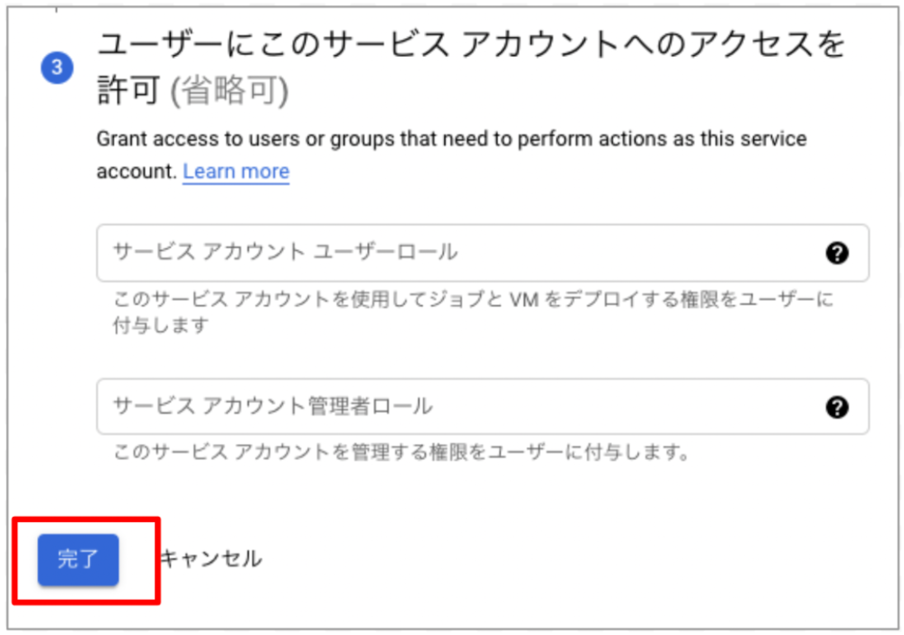 画面下の「完了」をクリックするとサービスアカウントが作成されます。