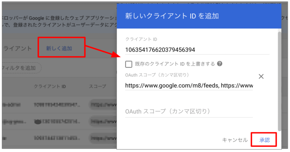 クライアントID:「3. OAuthのクライアントID作成」の作業で確認した「一意の ID」を入力