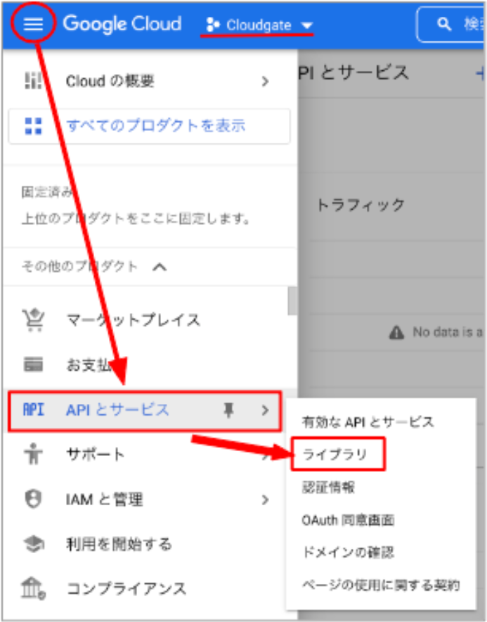 プロジェクトの作成が完了したら、プロジェクト「CloudGate」を選択した状態で、ナビゲーションメニュー(画面左上の「三本線のアイコン」)から「APIとサービス」>「ライブラリ」をクリックします。