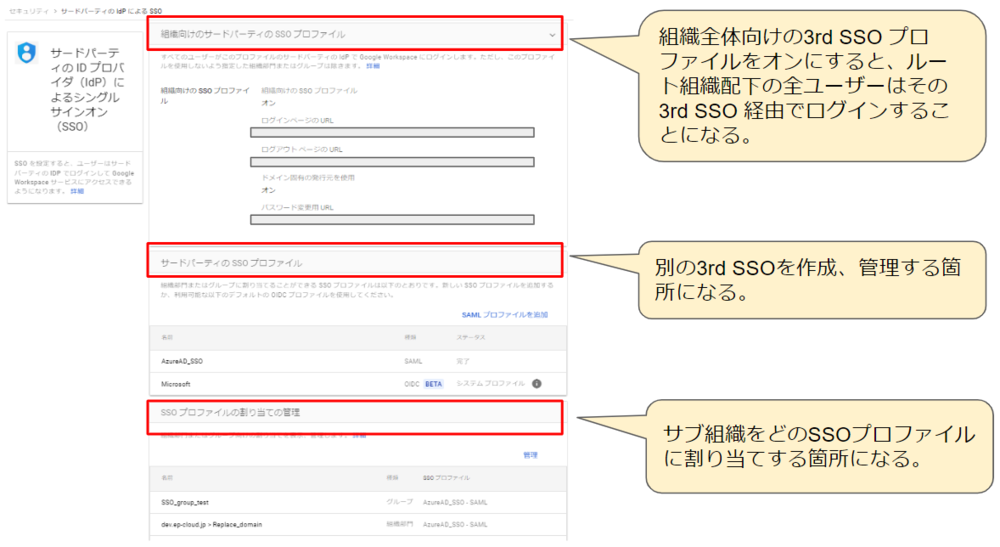 2、組織全体がルート組織SSOに割り当てられたもとに、1つのグループに対して別のSSOプロファイルを割り当てることができる。