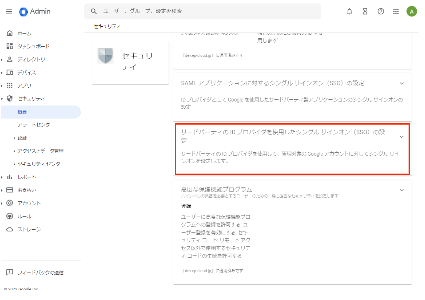 セキュリティ >設定 >サードパーティの ID プロバイダ(IdP)によるシングル サインオン(SSO) >組織向けのサードパーティの SSO プロファイルにアクセスします。