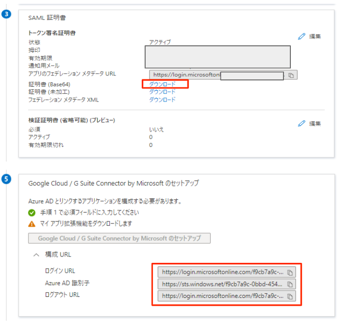 次に 「Google Cloud / G Suite Connector by Microsoft のセットアップ」の欄にある「ログイン URL」「Azure AD 識別子」「ログアウト URL」の値がそれぞれGoogle Workspace 管理コンソール側の設定をするために必要な値になるので、それぞれクリップボードにコピーして控えておきます。