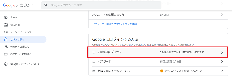 ※Googleアカウントにログインしたうえで、アカウントのセキュリティーページにアクセスします。