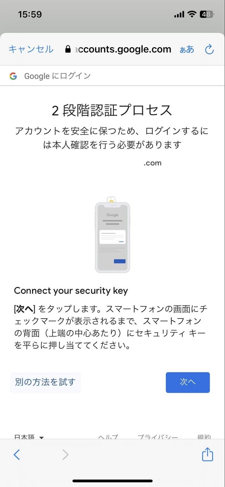 Googleのアカウントにログインをし、ID/PWを入力後にポップされる画面に沿って、二段階認証としてTITAN物理キーを利用します。