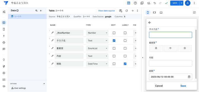 私の場合はタスクリストを作るので、タスク名、重要度、内容、期限の4項目を入力しました。