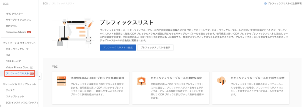 Prefix listは「Elastic Compute Service」コンソールの画面のメニューとして表示されています。では、早速「プレフィックスリストの作成」をクリックしPrefix listを作成します。