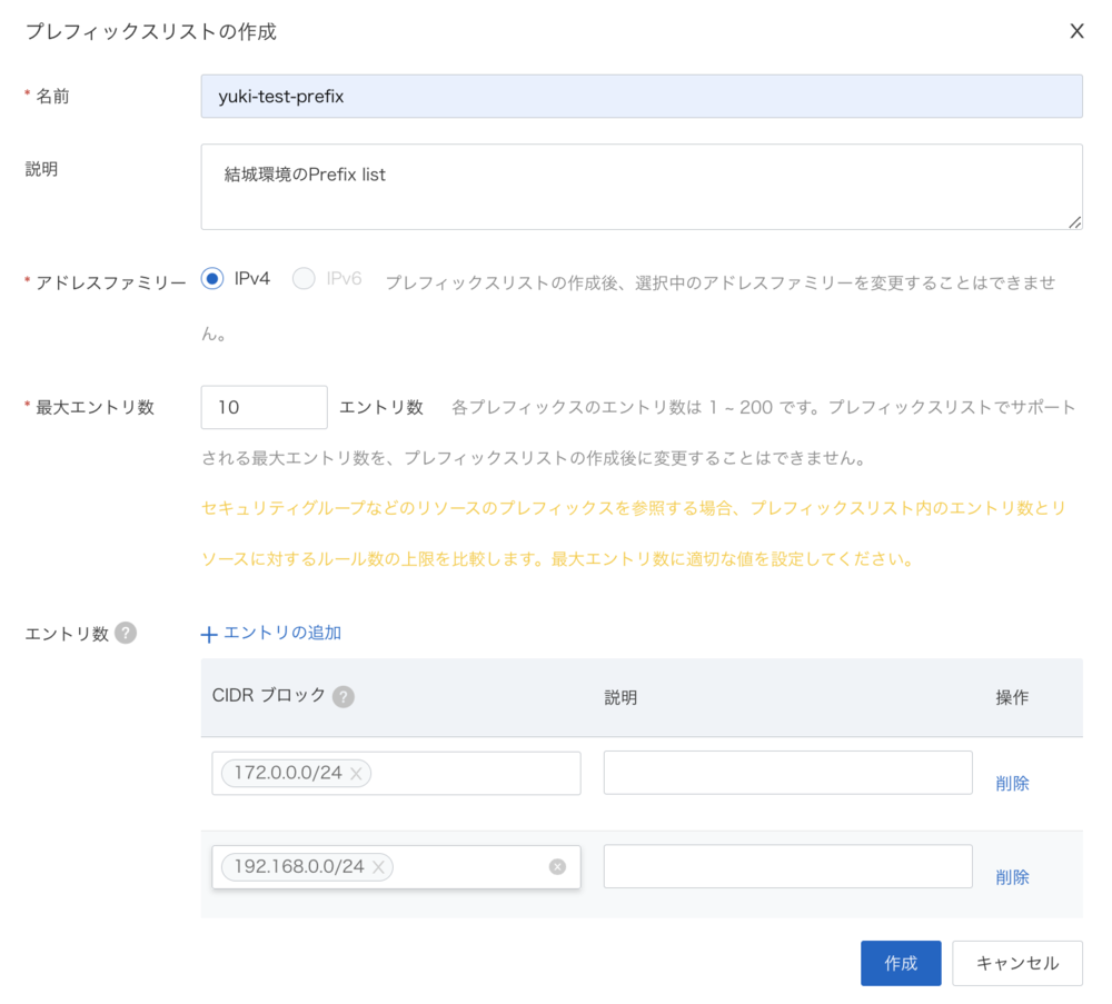 なお、Prefix listに追加できるのは、ネットワークプレフィックス(CIDRブロック)のみで、特定のIP(47.xx.xx.xx)をリスト化できる機能ではないことをお含みおきください。
