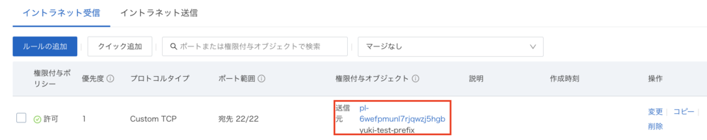 セキュリティグループのルールを確認すると権限付与オブジェクトで先程保存したルール(Prefix list)が指定されたルールが表示されていることが確認できます。