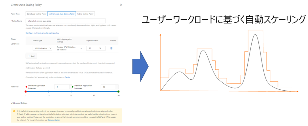 SAEはユーザのワークロード(トラフィック増減)やCPU/メモリ使用率などに応じて、自動的にスケーリングすることができます。手動スケーリングや、カスタマイズしたスケーリングもできます。例えば営業時間外など、ユーザのワークロードが無いときはアプリケーションをスケールダウンしコストを抑制することができます。