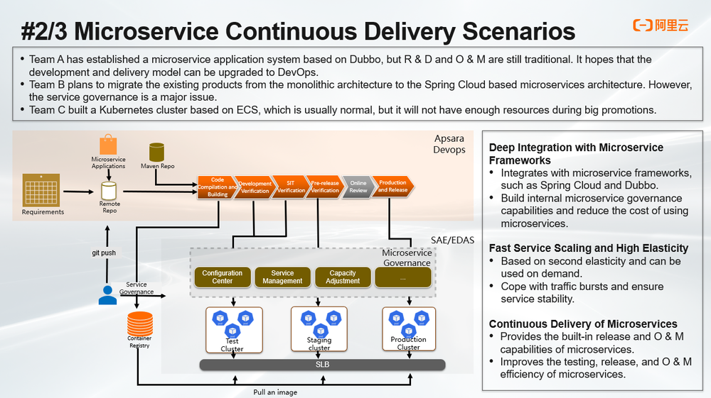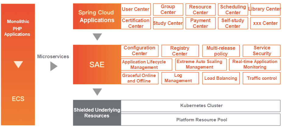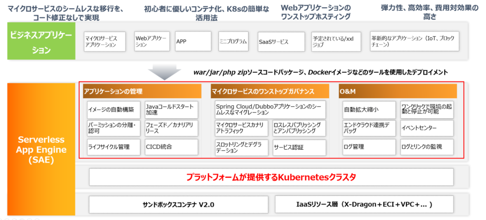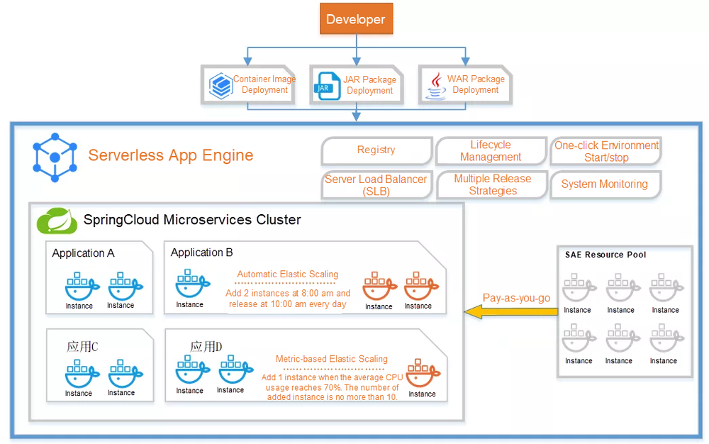 SAEを使用することで、複雑で対応に時間がかかる開発作業とは対照的に、慣れた言語によるコードやDevOpsツールによるサービス、Spring Cloud/Dubboなどのマイクロサービス、コンテナやパッケージ化したファイルを素早くデプロイし、ユーザのワークロードに応じて自動スケーリングするWebサービスとして提供することができます。