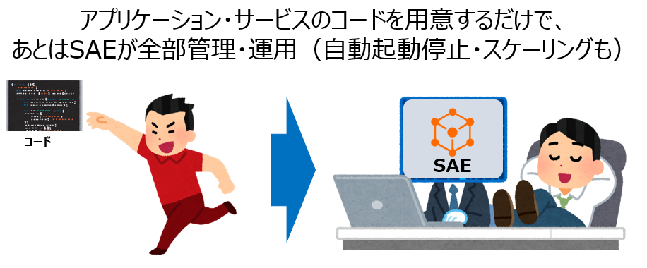 SAEはサーバのプロビジョニング、スケーリング、バッチ適用などの往来のインフラストラクチャ管理を自動化してくれるため、開発者はIaaSら仮想コンピューティングの運用を行う必要はなくなります。