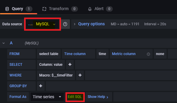 2-5 ) Data sourceを「MySQL」に変更し、「Edit SQL」をクリックします。