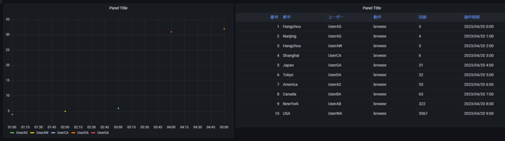 insert into test.table_grafana values (5, 'Japan', 'UserGA', 'browse', '2023/04/20 4:00', '31');
