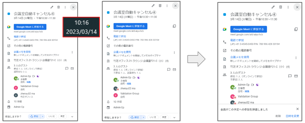 結果は下記の通り、開始まで10分を過ぎて全員キャンセルした場合、予約した会議室が自動的にキャンセルされませんでした。