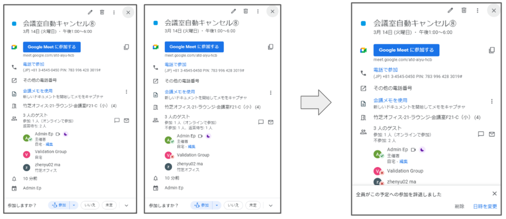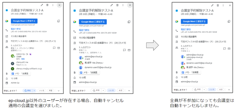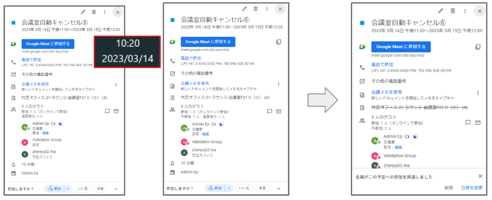 最後は、長時間(4時間以上)の会議のために予約した会議室について、事前に主催者以外の参加者が辞退しても自動的にキャンセルされませんでした。注意してください。