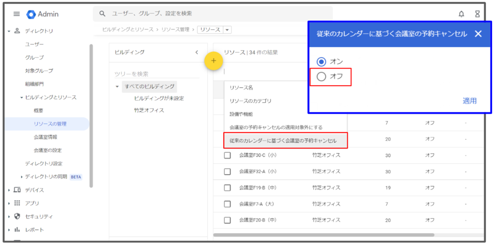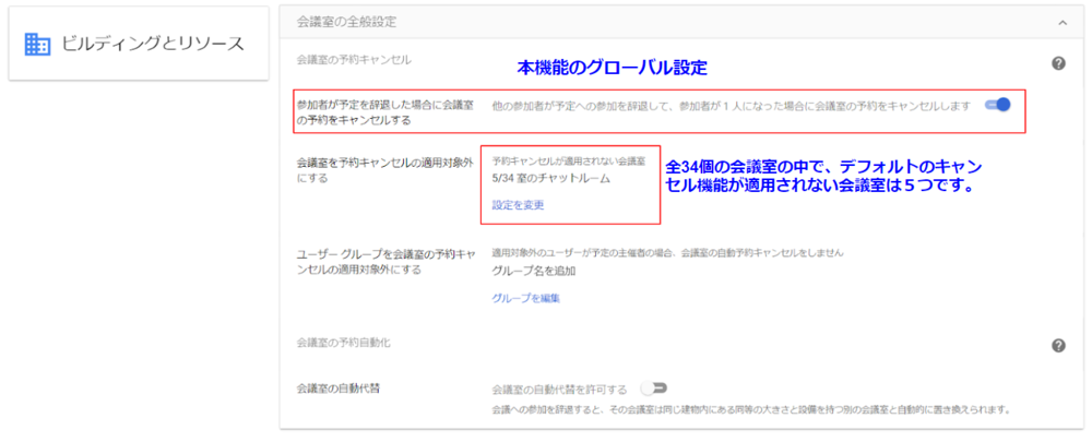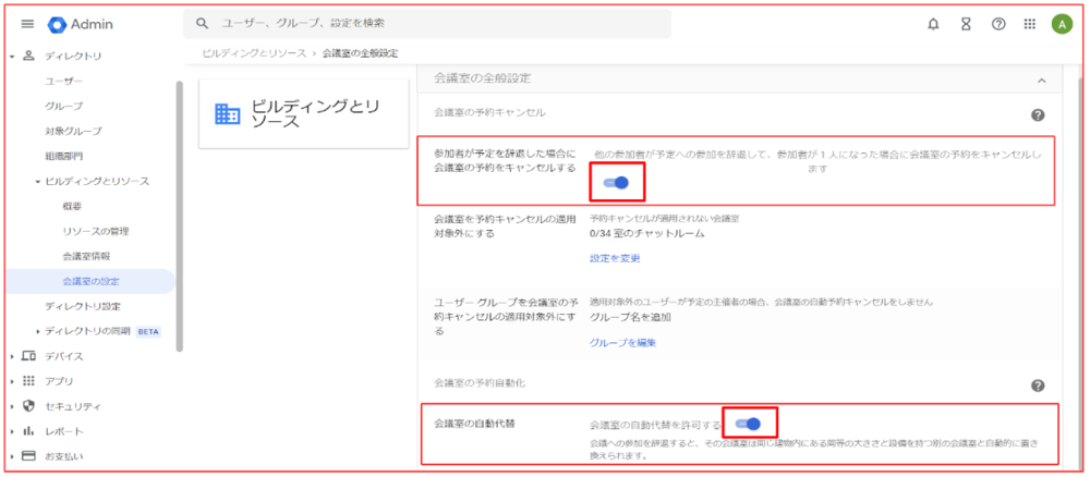 その後、管理コンソールで、「ディレクトリ」>「ビルディングとリソース」>「会議室の設定」に進み、「参加者が予定を辞退した場合に会議室の予約をキャンセルする」と「会議室の自動代替を許可する」との2つの設定をオンにします。