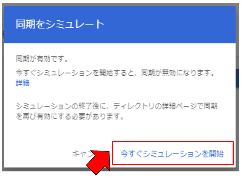 「安全保護対策」にてデフォルトのままで「同期をシミュレート」に進み、「今すぐシミュレーションを開始」をクリックします。