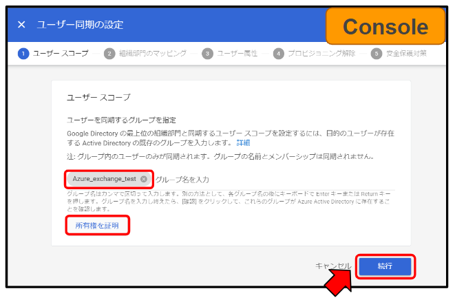 「ユーザースコープ」のユーザーを同期するグループを指定する所に、「Azure_exchange_test」とのグループ名を記入し、【所有権を証明】をクリックし、【続行】に進みます。