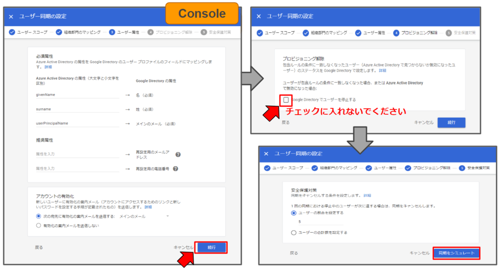 確認完了後、GWSコンソールの【ユーザー同期】に戻って設定します。