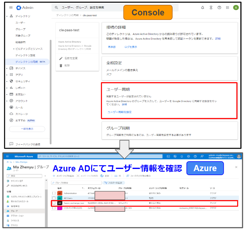 手続きとして、GWSコンソールにて【ユーザー同期】に進むと同時に、AzureADにて同期予定のユーザー情報を確認します(「Azure_exchange_test」を確認した)。