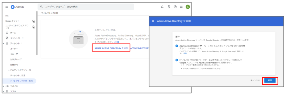 まずはGWSコンソールにて【AZURE ACTIVE DIRECTORY を追加】をクリックし、【続行】に進みます。