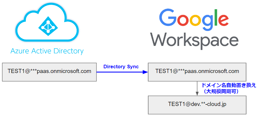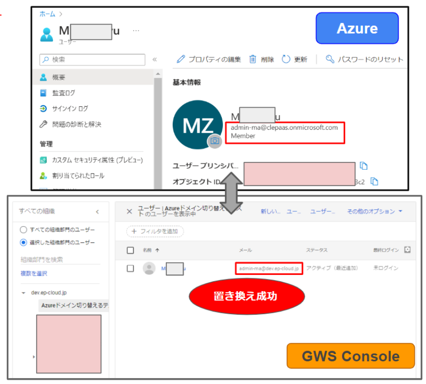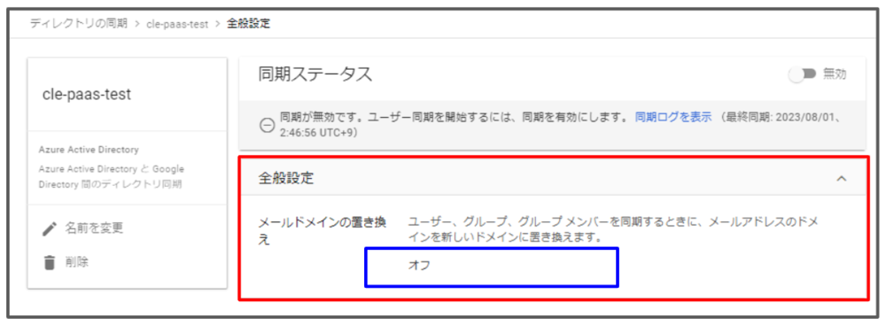 同期実行完了後、GWSコンソール上で同期された元々[***paas.onmicrosoft.com] のドメインが自動的に [dev.**-cloud.jp] のドメインに切り替えることを確認できれば、本検証は成功と言えます。